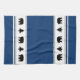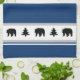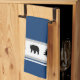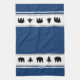 This kitchen towel is shown in a cute lodge style print of bears and fir tree icons in black silhouettes over white and grey stripes and sapphire blue and white colour accent stripes towel.