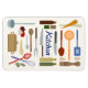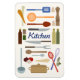 Colourful illustrations and typographic design of kitchenware and food ingredients on a cream colour background.