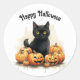 Sweet, picture of a black kitten sitting with pumpkins, is featured on this round sticker for Halloween. With message, "Happy Halloween", makes this sticker great for special mailings, decorating, scrap booking and more!