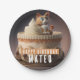 Birthday paper plates featuring a kitten birthday cake with "Happy Birthday", all-caps bold font. Customise it by adding your name(s).