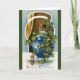 Cute vintage Christmas card with a kitten peeking out of a blue vase and some holly. At the bottom "A Merry Christmas". Blue and Green colours with a dash of gold. Matching postage available