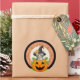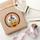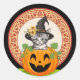Adorable partial AI generated Halloween sticker depicts an adorable kitten wearing a witch's hat sitting in a smiling pumpkin, inside an intricate circle.  Utilise these stickers on party favours, cards, and more!  Available in two different sizes.