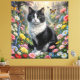 A black and white cat sits amidst a vibrant garden of colourful flowers, with butterflies fluttering around it. The scene is bathed in soft, warm lighting, creating a fairy-tale-like atmosphere.