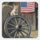 An adorable orange kitten sits atop a wooden wagon wheel. In the background, a hay bale and an American flag are visible against a rustic barn wall