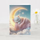 A white kitten wrapped in a cosy pink blanket rests on a glowing crescent moon, surrounded by fluffy clouds and twinkling stars.