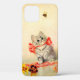 iPhone Case featuring Meta Plückebaum’s artwork Kitten with a Red Ribbon (b. 1876). A grey kitten with dark stripes is beautifully adorned with a red ribbon. The kitten plays with a bee. Yellow flowers decorate the foreground. A wonderful gift for cat lovers and German art enthusiasts!