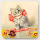 Coasters featuring Meta Plückebaum’s artwork Kitten with a Red Ribbon (b. 1876). A grey kitten with dark stripes is beautifully adorned with a red ribbon. The kitten plays with a bee. Yellow flowers decorate the foreground. A wonderful gift for cat lovers and German art enthusiasts!