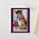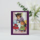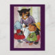 Mama cat is getting her three kittens ready to go to school. The mother cat is wearing spectacles and a purple polka dot dress and white apron. She's tying the bonnet of one of her kits. The kittens are carrying their slates and primers and all three kittens are wearing different types of hats in this vintage postcard from 1907.