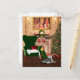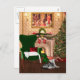 Three kitty cats in a Christmas setting holiday postcard. A white cat lazing in a chair, a calico cat playing with a Christmas tree ornament and a silver tabby simply contemplating mischief. Great for cat lovers or multiple cat owners