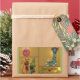 Green frame, orange brown background with folk primitive illustrated cats in a burgundy satin ribbon bow, bordered with balls of yarn and hearts. Decorative unique cards and gifts with a kitty in a stocking. Cats, red ball ornament and yarn border illustration by Trina Clark. Design by Deborah Miller.