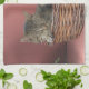 This kitchen towel features an adorable kitty cat napping in a basket.