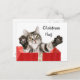 Young silver tabby kitty reaches out of a red gift box to give a Christmas hug holiday photo greeting card