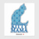 Sticker in a silhouette of an elegant cat, in a dark to light denim blue pattern, sitting on the words "Kitty Mama" in denim blue
