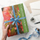 Christmas wrapping paper with a continuous pattern featuring a beautiful celebratory NZ Xmas tree, the Pohutukawa, it's red flowers blooming in the Kiwi summer. There is custom text to put in a holiday greeting that you prefer, in white text against a pretty green,