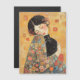 A dreamy, Klimt-inspired painting of a woman embracing a black cat, featuring intricate floral and gold patterns. The warm hues and delicate brushstrokes evoke a sense of love, comfort, and artistic elegance.
