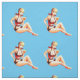 Vintage Pinup Blonde Bikini Model kneeling at the edge of the sand as waves splash her, to customise