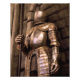 A photo of a Knight in a suit of armour from the mediaeval times. He is standing guard in front of an old castle door.