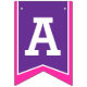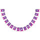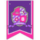 Knights mediaeval shield themed pink and purple Happy birthday flag party bunting. Personalise with your child's birthday year. Currently reads Happy 8th Birthday. Matches other items in the princess knights mediaeval shield girls collection. Features a regal shield in purple and pink with a unicorn head, star, age number and princess crown design. All original art and design by Sarah Trett. www.sarahtrett.com for www.mylittleeden.com