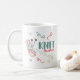 This yarn addicts coffee mug carries the funny pun "knit happens", popular with knitters and crafters. The design features a multi-coloured self-striping ball of yarn with knitting needles and some wiggly yarn tails. The fun saying is written in hand-lettered, brushed typography. It has a gentle colour palette of Teal Blue, Muted Red, Oatmeal Grey and Seaglass Green. Please browse our store for matching and co-ordinating products.