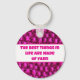 Let the world know about your love of yarn with this keychain featuring bright pink knitted yarn along with "The Best Things In Life Are Made Of Yarn". The back features the same pink knit pattern