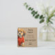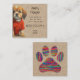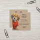 Square business cards for a knitting teacher, or fiber business. A cute puppy in a red-orange sweater is the design. Printed back text templates hold a name, profession or service, contact number, e-mail and website, as needed. A paw print of yarn on the back, with Kraft paper shown.
