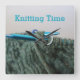 Grey yarn being knit with blue knitting needles. Time to knit!