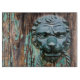 This close-up image shows a fascinating door knocker depicting a lion's head, with wood grain, dark streaks, knots, and splinters of turquoise paint in the background, all of which contribute beautifully to its rustic charm and natural appeal. This timeless design is reminiscent of old-world craftsmanship and adds a touch of warmth and character to any decor. The faded paint on the wood enhances this effect by creating a textured, layered look that evokes the history and stories contained within its fibres. Such a design introduces a sense of nature and tranquillity. With its earthy tones and authentic feel, this kind of home and living accent transforms your space into a serene retreat, combining natural elements and aesthetics.