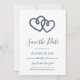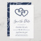 Our coastal chic summer wedding save the date cards feature classic nautical styling in navy and white. A pair of entwined open hearts formed with knotted nautical rope appears at the top, with "save the date" beneath in modern script typography. Personalise with your save the date details in a chic combo of serif and sans serif lettering. Perfect for nautical, summer or beach themed weddings. Save the date cards reverse to a pattern of looping white rope on navy blue.
