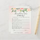 This baby shower game card features beautiful soft pastel watercolor roses and peonies in shades of blush pink and peach with lush green botanical leaves and eucalyptus.