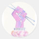 Pink power fist with knitting needles, hank of yarn, and word RESIST