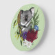 A cute koala bear on a tree limb with flowers and eucalyptus leaves in a backdrop of green