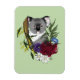 A cute koala bear sitting on a tree limb with flowers and eucalyptus leaves in a backdrop of green