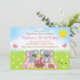 This cute and whimsical birthday invitation features adorable bears having a picnic on a pink gingham cloth with treats such as honey, watermelon, strawberry jam, lemonade and pie. In the background is a bright blue sky and sunshine, butterflies and daisies. The text combines decorative and serif fonts for a stylish and modern look. This is perfect for a spring or summer birthday party.