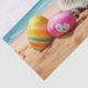 Koala wearing glasses relaxing on a sandy beach with colorful easter eggs