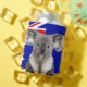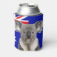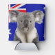 This furry koala is a native of Australia. The Australian flag is in the background. They are easily recognizable by their stout, tailless body and large head with round, fluffy ears and large, spoon-shaped nose.