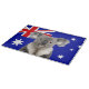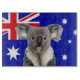 This furry koala is a native of Australia. The Australian flag is in the background. They are easily recognizable by their stout, tailless body and large head with round, fluffy ears and large, spoon-shaped nose.