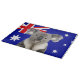 This furry koala is a native of Australia. The Australian flag is in the background. They are easily recognizable by their stout, tailless body and large head with round, fluffy ears and large, spoon-shaped nose.