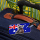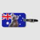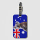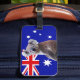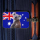 This furry koala is a native of Australia. The Australian flag is in the background. They are easily recognizable by their stout, tailless body and large head with round, fluffy ears and large, spoon-shaped nose.