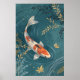 Stunning illustration of orange koi fish swimming in teal water with golden botanical elements. Elegant Japanese-inspired art perfect for creating sophisticated, zen-like spaces with Asian aesthetic.
