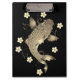 A gold oriental style koi fish, surrounded with gold flowers on a black coloured background.