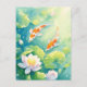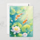 This serene and artistic design features two graceful orange and white koi fish shown swimming through a tranquil, sun-drenched water garden. The koi fish are captured in a gentle, swirling motion, their vibrant orange patterns standing out beautifully against the clear, light turquoise and teal depths of the pond. Surrounding the fish are large, vibrant green lily pads and delicate pink lotus blossoms with yellow centers that float elegantly on the water's surface. Beams of bright golden sunlight filter down from the top right, illuminating the scene with a magical glow and creating shimmering light bubbles that dance in the water. The overall aesthetic is clean, bright, and filled with natural harmony, making it an exceptional choice for nature lovers and fans of Zen-inspired aquatic art. This peaceful koi fish postcard is an ideal choice for sending a soothing "thinking of you" message or a quiet note of gratitude to a friend who appreciates the balance and beauty of a tropical water garden. You might choose to use this artistic card for a botanical-themed birthday invitation or as a lovely way to share a message of peace and prosperity with your family during a housewarming. It also makes a beautiful piece of mini-art for a workspace or a calming addition to a creative journal as a small token of aquatic elegance. This versatile design is also an excellent choice for a retirement message, a graduation thank you note, or as a heartwarming way to share a message of joy for any situation or event.