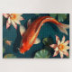 A beautiful orange koi with gold highlighting its scales swims among cream and pink waterlilies on this gorgeous jigsaw puzzle. Perfect for anyone who loves gardens and koi ponds.