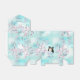 A cute kokeshi doll in a dusky pink turquoise kimono unter a pink cherryblossom tree. With a turquoise bokeh background. With a custom text in an elegant font for girl´s birthdays.