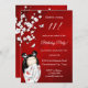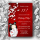 A cute kokeshi doll in a white red Kimono unter a white cherryblossom tree. With a shimmering red background. With a custom text in an elegant font for girl´s birthday parties.