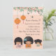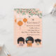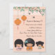 An adorable invitation for a little girl's celebration featuring three Japanese dolls dressed in kimonos under a bamboo tree branch. Hanging lanterns and two birds fly above.