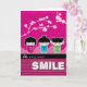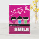 Cute and colorfull greeting, decorated with kokeshi (japanese dolls), pink background and cherry flowers