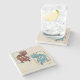 This is a stone coaster with original photo artwork of two kokopelli, one rust and the other turquoise.