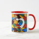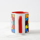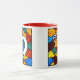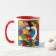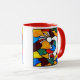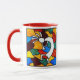 White and red 11 oz. ringer combo mug with a stained glass image, on both sides, of the deity Kokopelli.