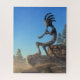 A digitally created image of what a statue of Kokopelli might look like: A statue of Kokopelli, carved from grey stone, sits on a pile of boulders on a hilltop in the wilderness of the American West.