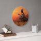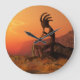 A giant stone Kokopelli statue sit on some rocks in a desert. The red sunset illuminates the arid valley which is filled with yellow grasses and cacti. The right side of the image is dominated by rocky mesas.
